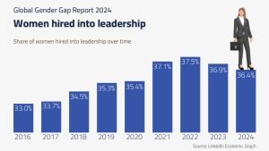 In 2022, the global hiring rate for women into leadership roles topped 38%. It has fallen each year since and is now down to 36%.